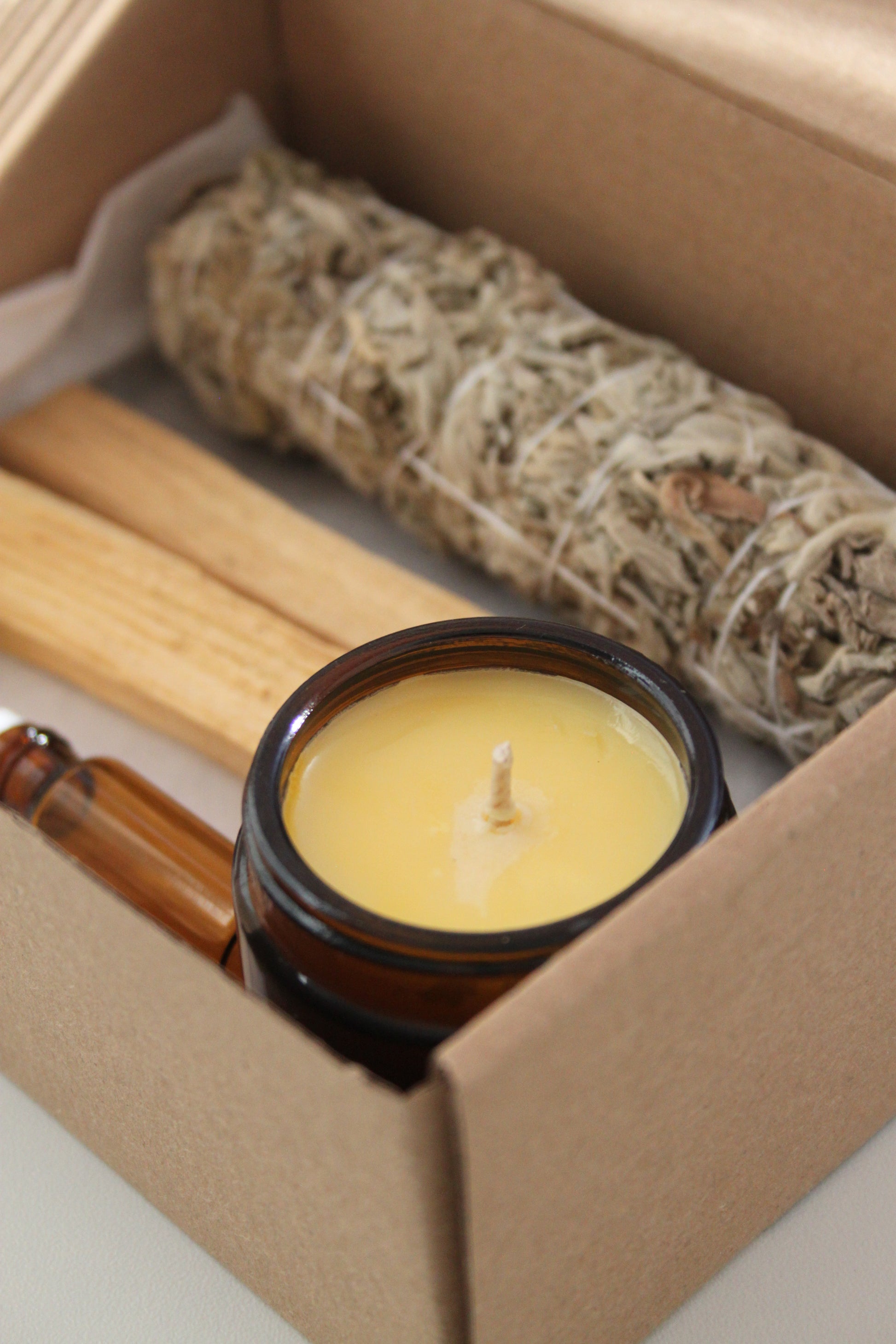 The Zen set is thoughtfully curated and features sage, Palo Santo, a mini candle, and a paired calming essential oil blend.